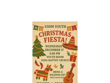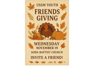 Join us for USSM Youth Friendsgiving on Wednesday, November 19 at 5:45 PM in the Youth Room at Soda Baptist Church! We’ll come together for food, fun, and fellowship as we give thanks to God for all He has done. Bring a friend and celebrate His blessings with us!