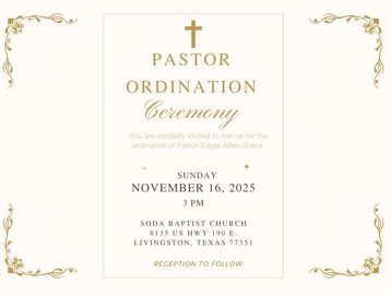 Soda Baptist Church joyfully invites you to the ordination of Brother Edgar Grace on November 16th at 3:00PM. This sacred service recognizes God’s call upon his life and his dedication to ministry. All are welcome to share in this moment of worship and celebration. A meal will follow the service.
